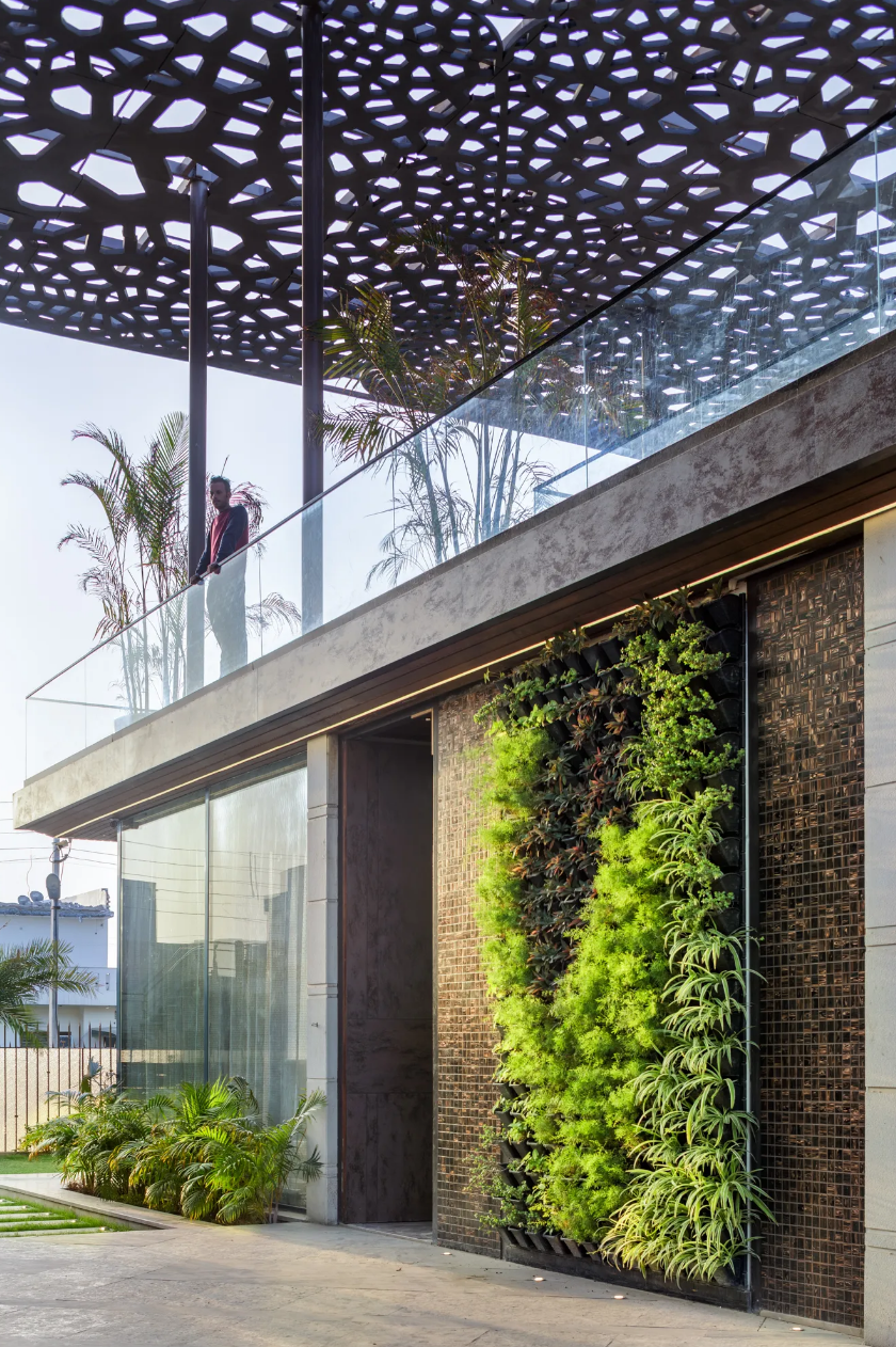 The entrance is a palatial space that connects the two wings of the house. Clad in cooling Gwalior mint stone, the entrance sees a diffused interplay of light and shadow, which makes it accessible throughout the day. The entrance doors, which are 13 feet tall and 5 feet wide, extends off an MS-frame partition that doubles as a vertical garden. The Laminam finish creates the texture of rusted iron, which brings a sort of rustic aesthetic to the otherwise expansive, contemporary space.