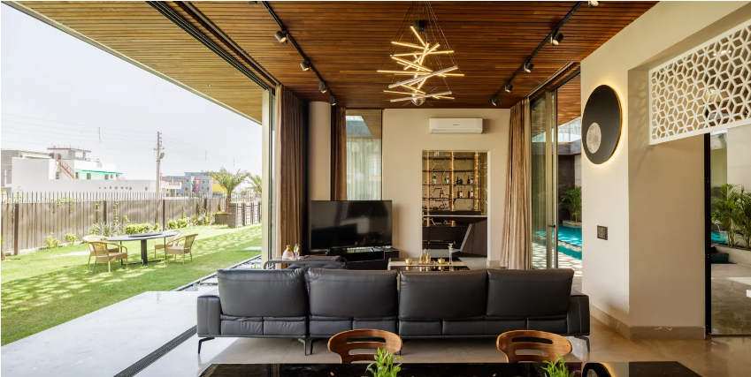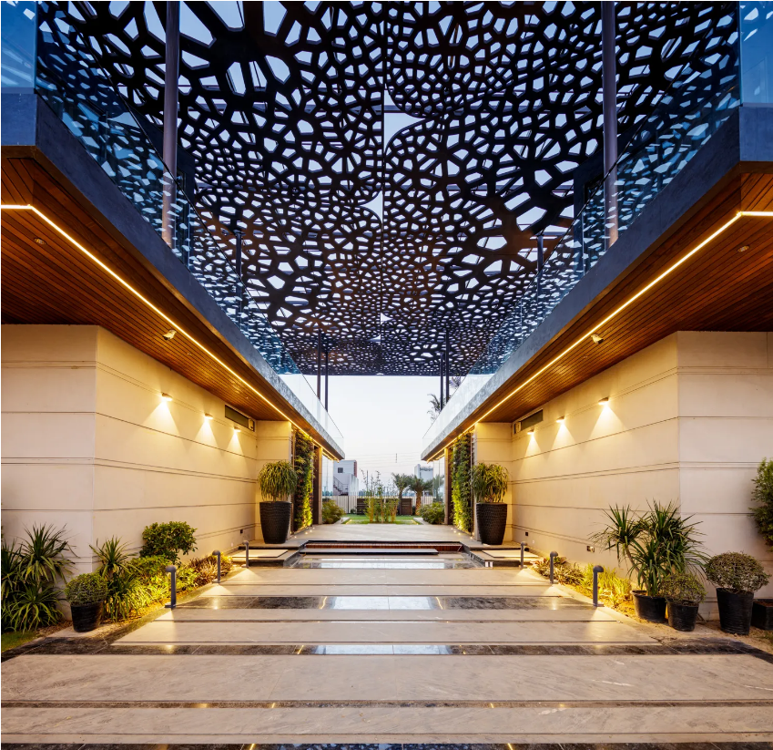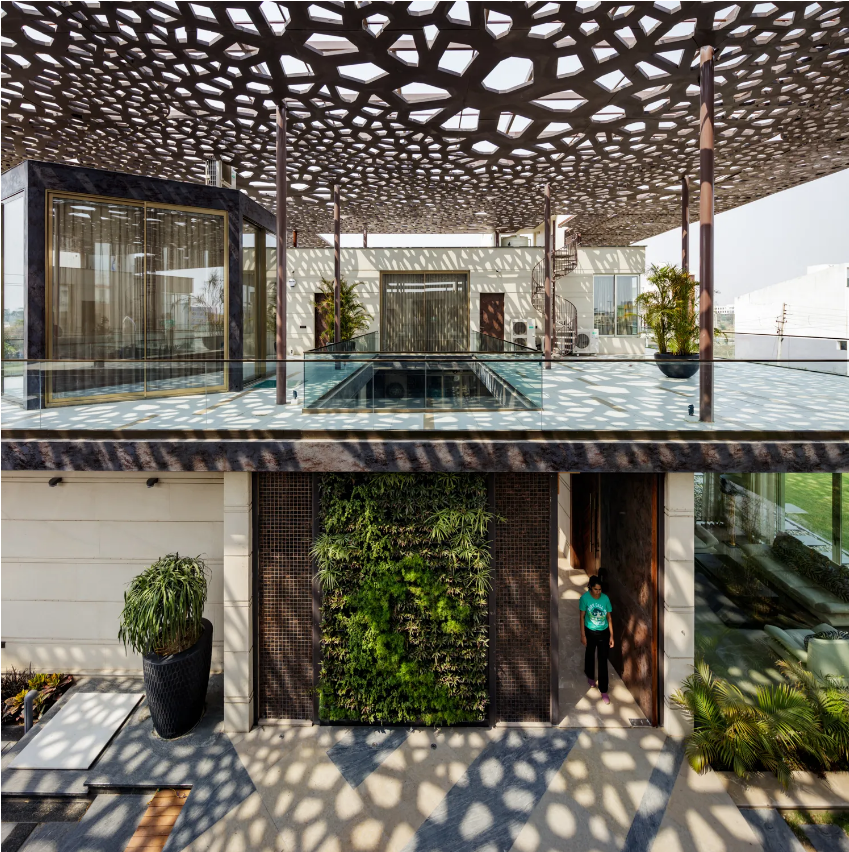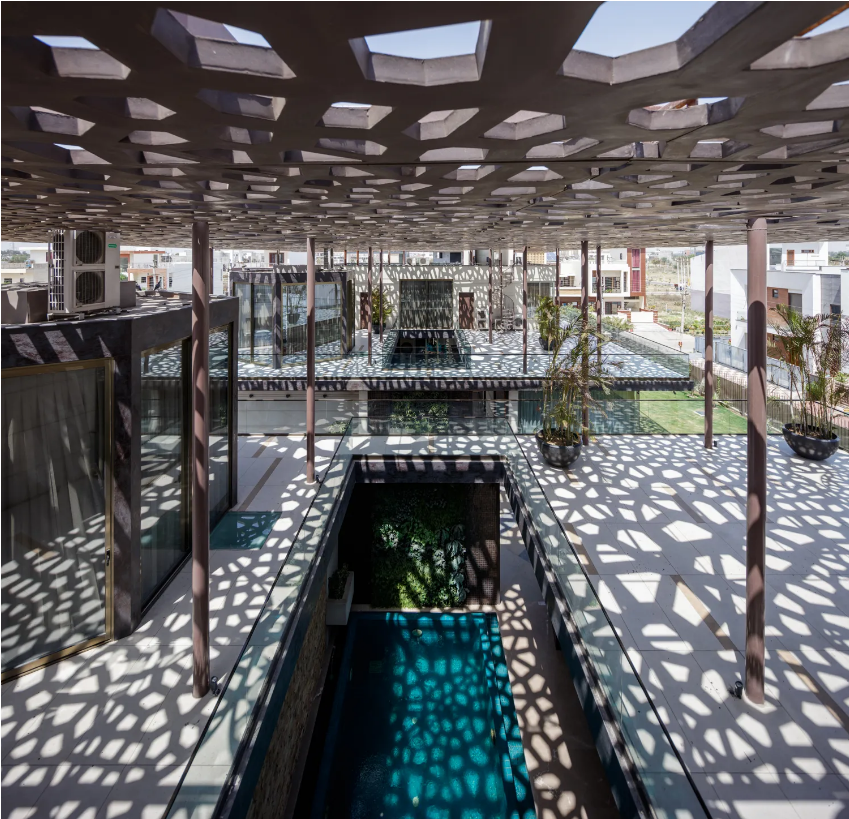 The canopy—which is crafted in digitally modelled, fibre-reinforced polymer set on an MS (mild steel) framework—is meant to replicate the experience of being in a rainforest, where filtered sunlight dapples through leaves. “We wanted to keep the roof as a very organic element,” says Rastogi, “so it doesn’t take away from the natural elements with which the house is built.” The canopy also serves the function of making all outdoor areas—including the swimming pool—accessible at all times, including during the harsher summer months. “Throughout the day, the shadow patterns keep changing and the same spaces have a different experiential quality,” he adds, “During the night, the dark colour blurs with the night sky.”